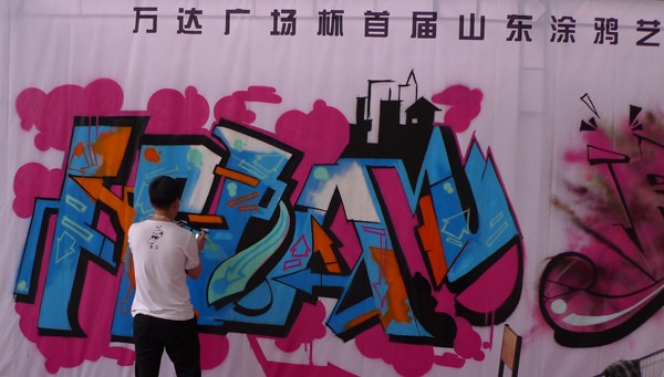 4月30日,在济南万达广场,来自济南、青岛、济宁、临沂、日照等地的12位涂鸦艺术家现场挥洒,共同演绎泉城时尚文化。