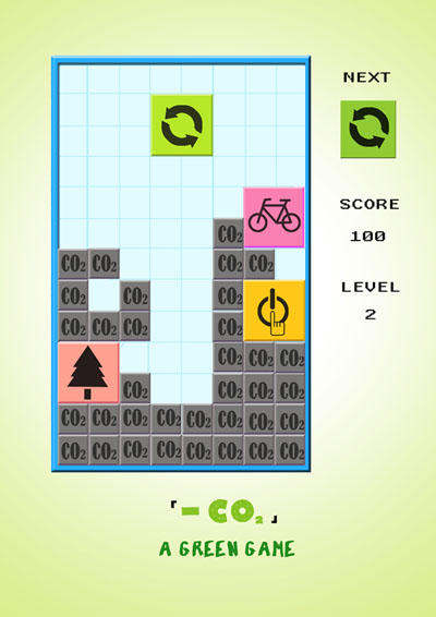 moliguxing :第一个作品是《绿色游戏,乐在其中》,通过俄罗斯方块游戏的模式来展现低碳生活的乐趣,将环保元素赋予游戏的方块,随着积累,将底层顽固的二氧化碳方块消除掉,海报画面将绿色的生活方式融入轻松的游戏氛围中,更有利于推广环保意识,借用俄罗斯方块这款耳熟能详的经典游戏,使得理念的传达达到事半功倍的效果。
